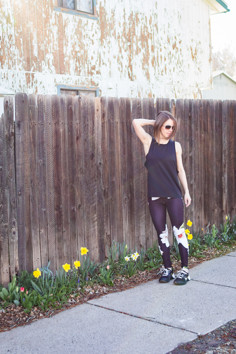 Workout outfit: muscle tank and floral leggings